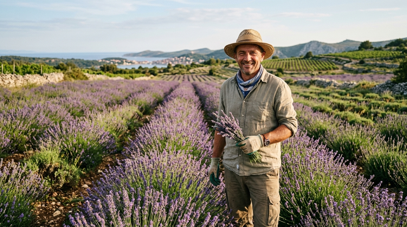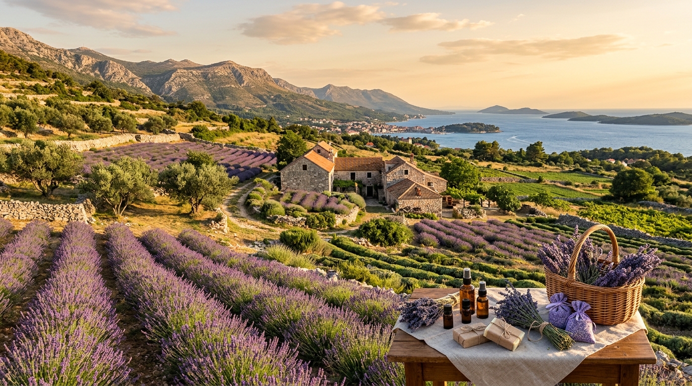 Pokažite slike hvarskih polja lavande i procesa destilacije. Kupci vole autentičnost.