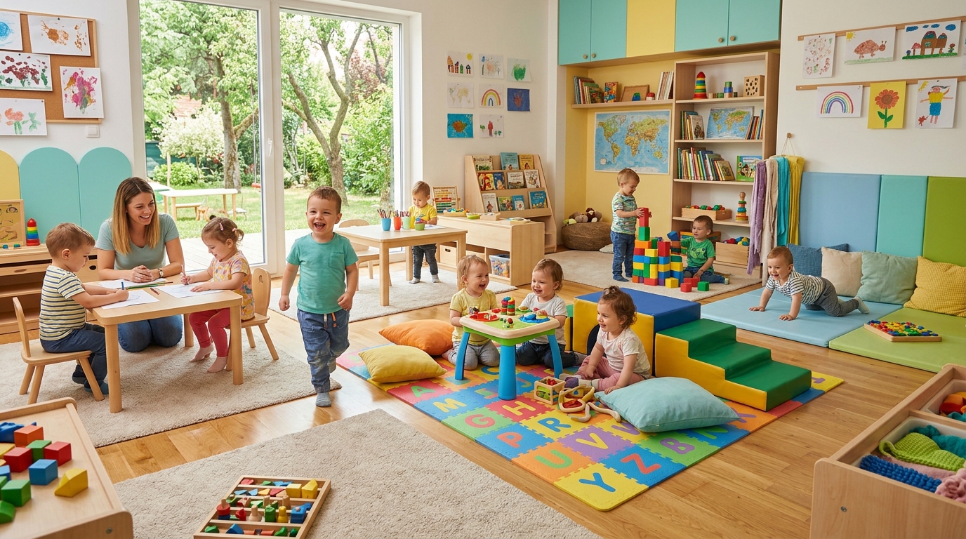 Naš umjetna inteligencija automatski odabire tople boje i prikladan dizajn na temelju riječi 'vrtić'.